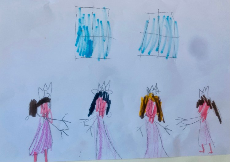 [LE SUPERBIMBE E IL PAESE DELLE STREGHE – Giulia, Camille e papà Gianni, disegno di Camilla, 2020-2023]